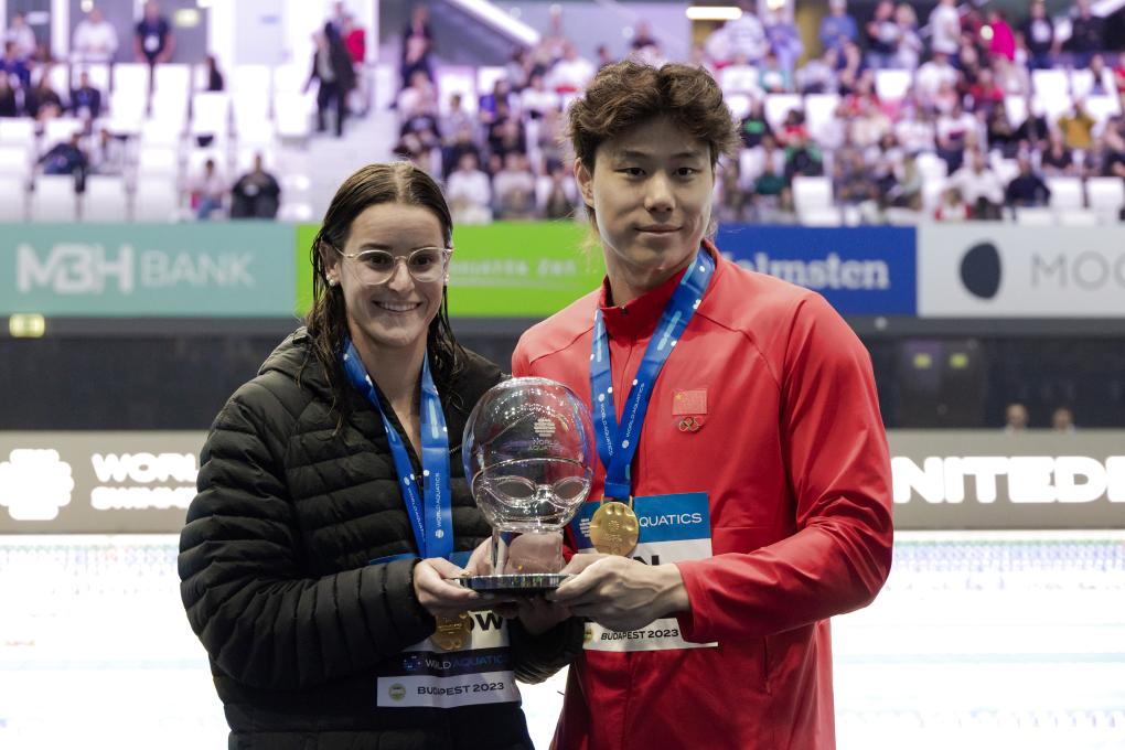 10月22日,覃海洋(右)和麥基翁獲得世界泳聯(lián)世界杯年度總冠軍。當(dāng)日,2023年世界泳聯(lián)游泳世界杯布達(dá)佩斯站落幕。新華社發(fā)(弗爾季·奧蒂洛攝)