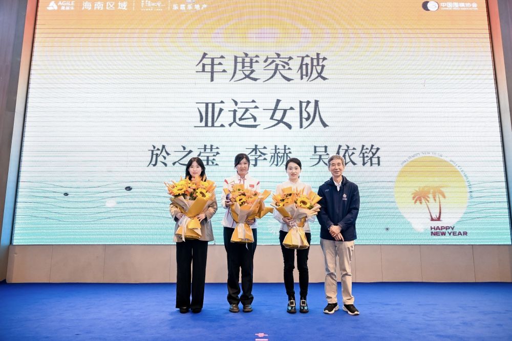 除了本賽季圍甲常規(guī)賽各獎(jiǎng)項(xiàng)外,中國圍棋協(xié)會為在2023年各大賽事中有精彩發(fā)揮的棋手設(shè)置了特別獎(jiǎng)。吳依銘、於之瑩、李赫組成的亞運(yùn)中國女隊(duì)榮膺年度突破獎(jiǎng),她們在杭州亞運(yùn)會獲得圍棋女子團(tuán)體冠軍,為中國隊(duì)奪得歷史上首枚亞運(yùn)會圍棋項(xiàng)目金牌。辜梓豪憑借在衢州爛柯杯擊敗韓國名將申真谞奪冠,獲得年度振奮獎(jiǎng)。一年內(nèi)包攬三星杯、LG杯兩大世界冠軍的丁浩獲得年度雙冠獎(jiǎng),成都女子圍棋隊(duì)獲得年度新軍獎(jiǎng)。