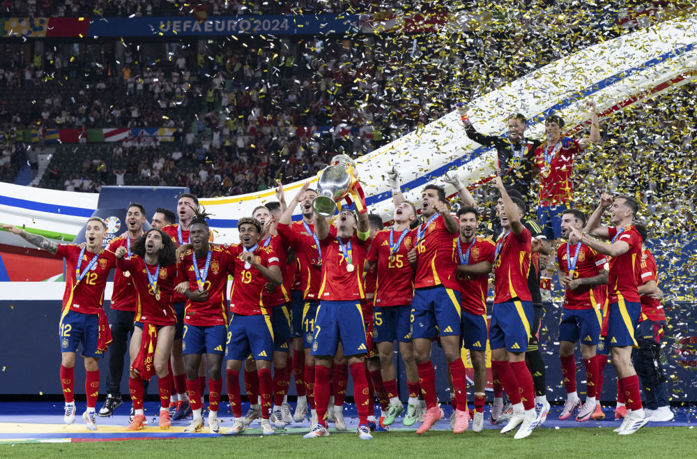 7月14日,西班牙隊在頒獎儀式上慶祝。當(dāng)日,在德國柏林進行的2024年歐洲足球錦標(biāo)賽決賽中,西班牙隊2比1戰(zhàn)勝英格蘭隊,第四次奪得歐錦賽冠軍。新華社記者 肖藝九 攝