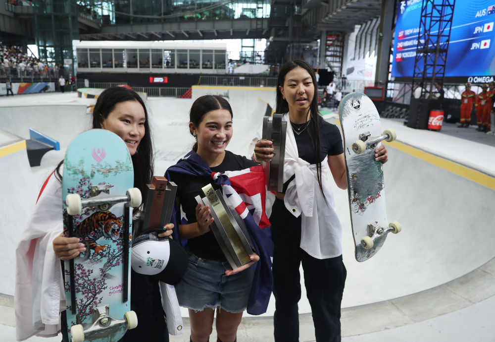 5月19日,冠軍澳大利亞選手阿麗莎·特魯(中)、亞軍日本選手開心那(右)與季軍日本選手四十住櫻在頒獎儀式后合影。當(dāng)日,在巴黎奧運(yùn)會資格系列賽上海站滑板女子碗池決賽中,澳大利亞選手阿麗莎·特魯奪得冠軍,日本選手開心那與四十住櫻分獲二、三名。新華社記者 賈浩成 攝
