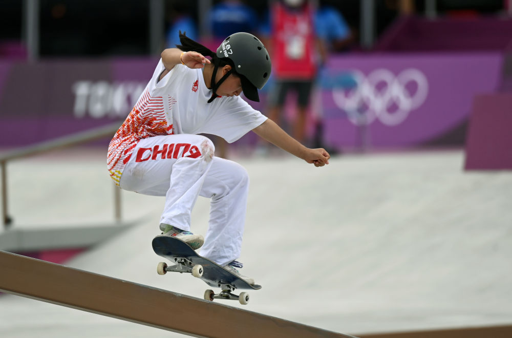 2021年7月26日,中國選手曾文蕙在比賽中。當(dāng)日,在東京奧運(yùn)會女子滑板街式賽中,中國選手曾文蕙闖入決賽,并最終獲得第六名。新華社記者 李尕 攝