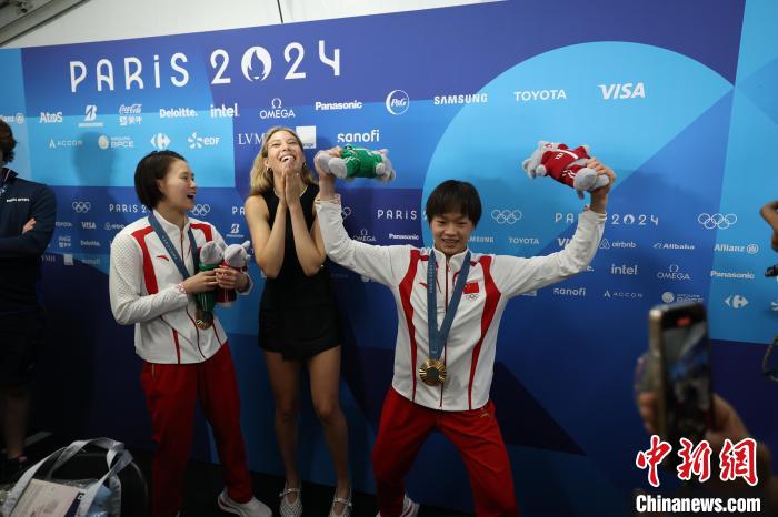 當(dāng)?shù)貢r間7月31日,在巴黎奧運會跳水女子雙人10米臺項目中,中國隊組合陳芋汐/全紅嬋獲得冠軍。谷愛凌(中)在賽后化身粉絲與陳芋汐(左)、全紅嬋合影。 中新社記者 富田 攝
