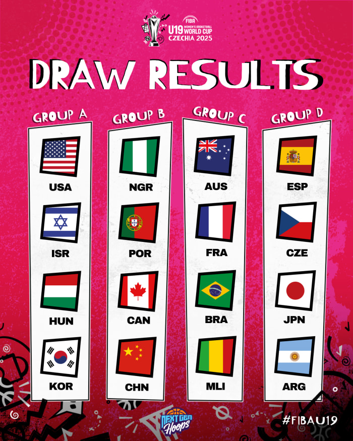 一共有16支來自世界各地的U19隊(duì)伍將參加7月12日至20日在捷克布爾諾舉行的U19女籃世界杯,這16支球隊(duì)被分為四個(gè)小組。A組包括美國隊(duì)、以色列隊(duì)、匈牙利隊(duì)和韓國隊(duì),C組是澳大利亞隊(duì)、法國隊(duì)、巴西隊(duì)和馬里隊(duì),D組是西班牙隊(duì)、捷克隊(duì)、日本隊(duì)和阿根廷隊(duì)。