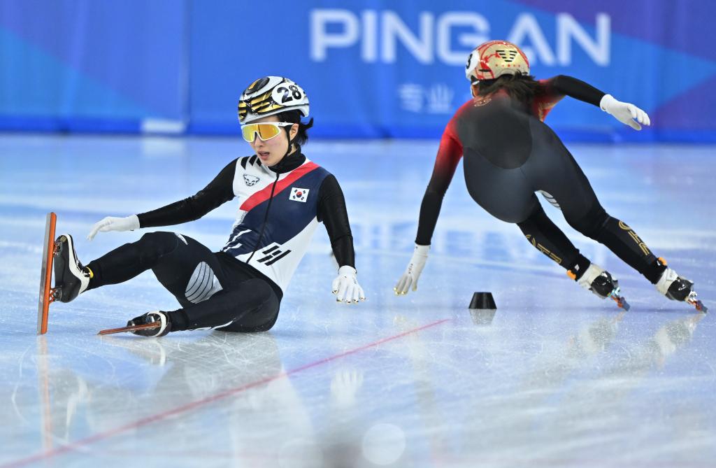 2月9日,中國隊(duì)選手公俐(右)在比賽中沖刺,韓國隊(duì)選手金吉莉在比賽中摔倒。新華社記者 江漢 攝