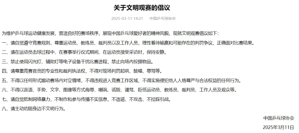 中國乒協(xié)表示,為維護(hù)乒乓球運(yùn)動(dòng)健康發(fā)展,營造良好的賽場秩序,展現(xiàn)中國乒乓球愛好者的精神風(fēng)貌,特提出文明觀賽的倡議。
