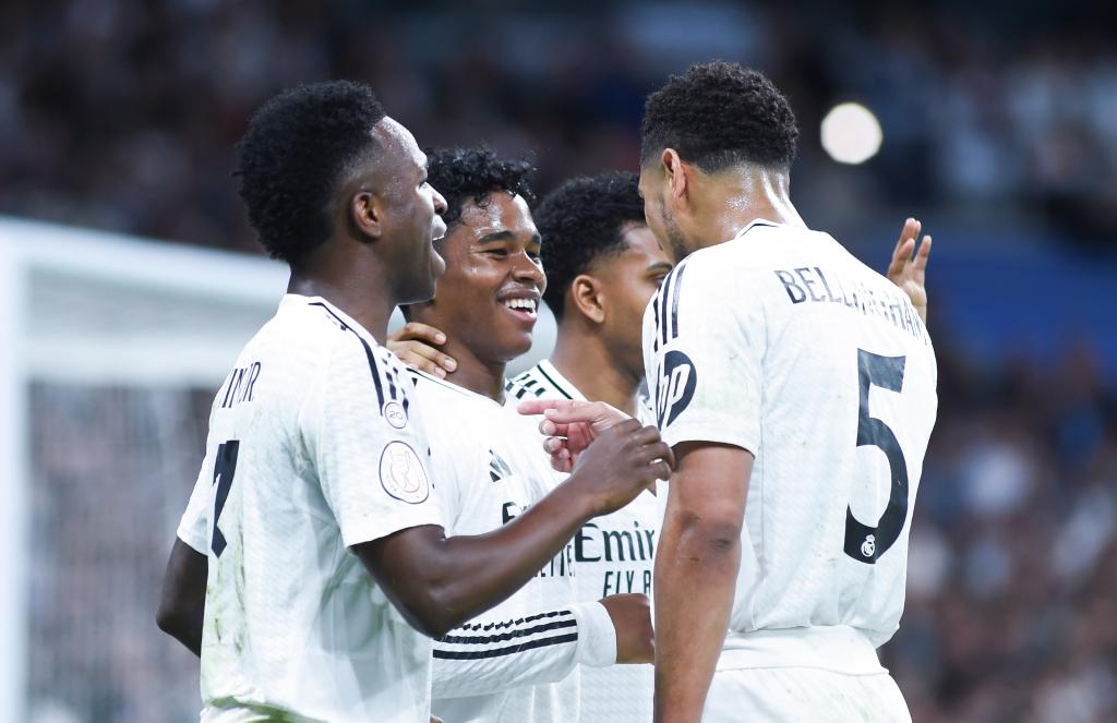 落在下風(fēng)的皇馬迅速連入兩球扭轉(zhuǎn)局面。第82分鐘,維尼修斯左路帶球一路奔襲入禁區(qū),并于底線附近送出傳中,貝林厄姆中路墊射破網(wǎng)。第86分鐘,楚阿梅尼又在小禁區(qū)邊緣將羅德里戈開出的角球頂入球門,助皇馬將場上比分扳為3:3平。
