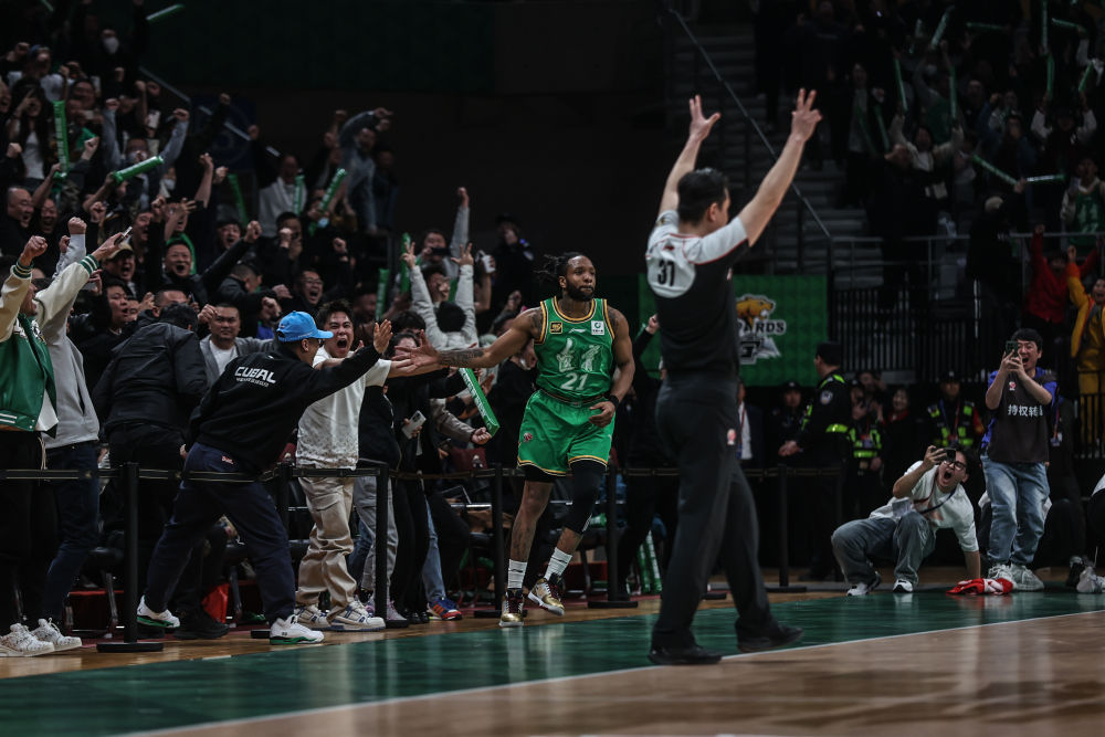 4月13日,遼寧隊(duì)球員威爾斯投進(jìn)絕平三分后慶祝。新華社記者 潘昱龍 攝