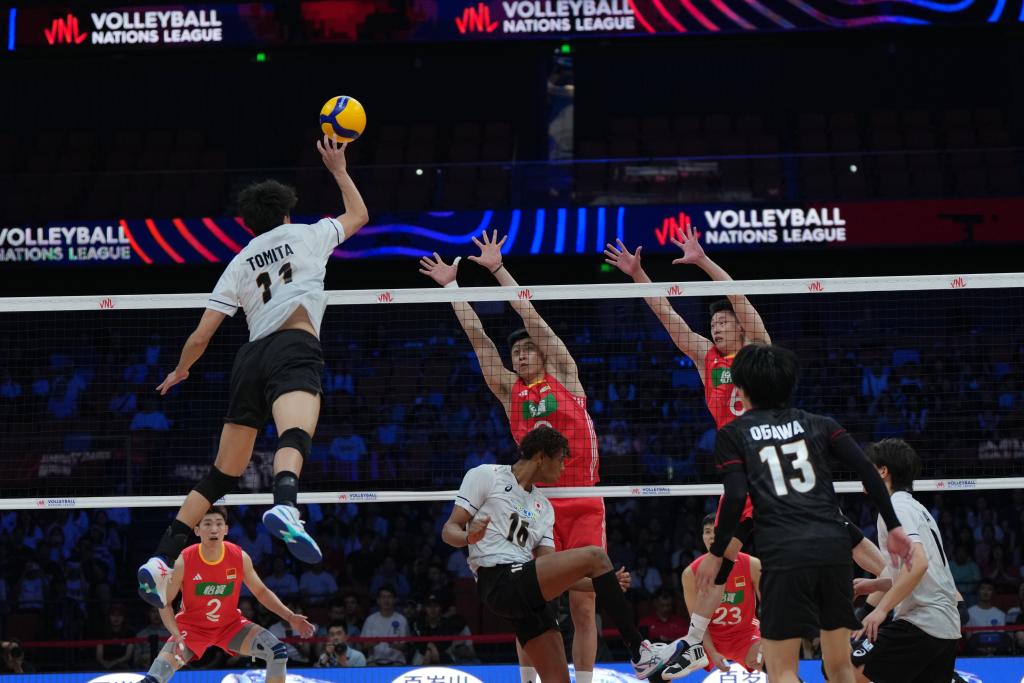 6月11日,中國(guó)隊(duì)球員李詠臻(上中)、俞元泰在比賽中攔截日本隊(duì)球員富田將馬(上左)的扣球。新華社記者 李一博 攝