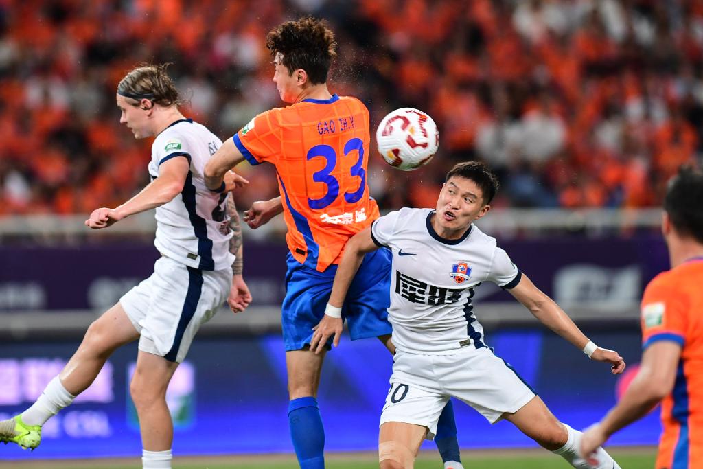 7月27日,山東泰山隊(duì)球員高準(zhǔn)翼(中)在比賽中爭(zhēng)頂。新華社記者 朱崢 攝