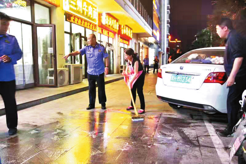 據(jù)了解,此次行動(dòng)共出動(dòng)執(zhí)法人員近30名。通過專項(xiàng)整治,進(jìn)一步規(guī)范了城區(qū)商鋪的經(jīng)營秩序,提升了居民的環(huán)保意識(shí)和文明意識(shí),營造了和諧文明的市容環(huán)境。圖為執(zhí)法人員與商家一同清理店鋪門前油污。(記者張志遠(yuǎn) 攝影報(bào)道)