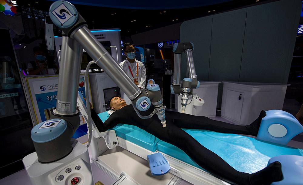 △2020年服貿(mào)會(huì)綜合展區(qū),參觀者正在體驗(yàn)中醫(yī)智能經(jīng)絡(luò)導(dǎo)引機(jī)器人。