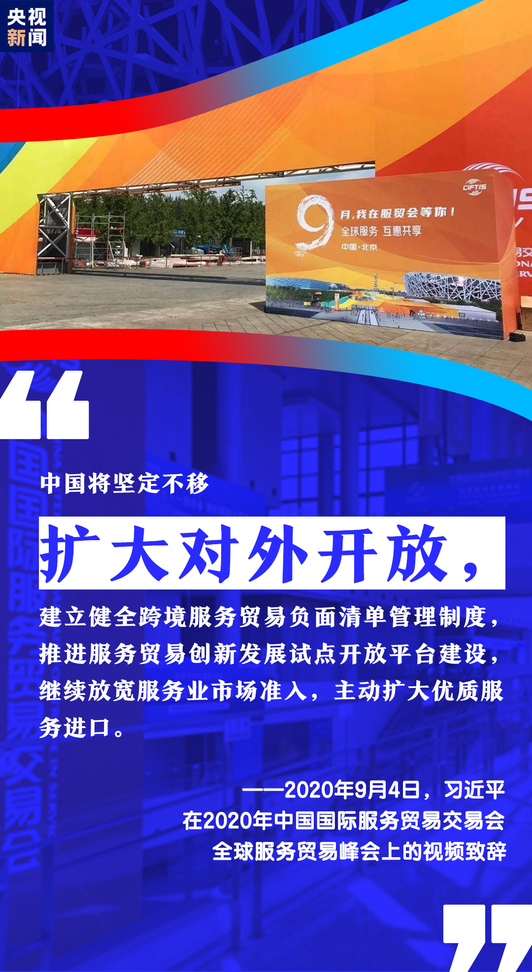 9月4日,2020年中國國際服務(wù)貿(mào)易交易會(huì)全球服務(wù)貿(mào)易峰會(huì)在北京開幕。習(xí)近平主席通過視頻方式在峰會(huì)上致辭。