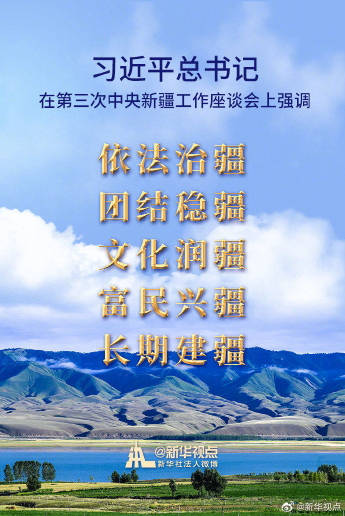細(xì)心的人們不難發(fā)現(xiàn),這次座談會則將有關(guān)要求拓展為“依法治疆、團結(jié)穩(wěn)疆、文化潤疆、富民興疆、長期建疆”,增加了“文化潤疆”和“富民興疆”。