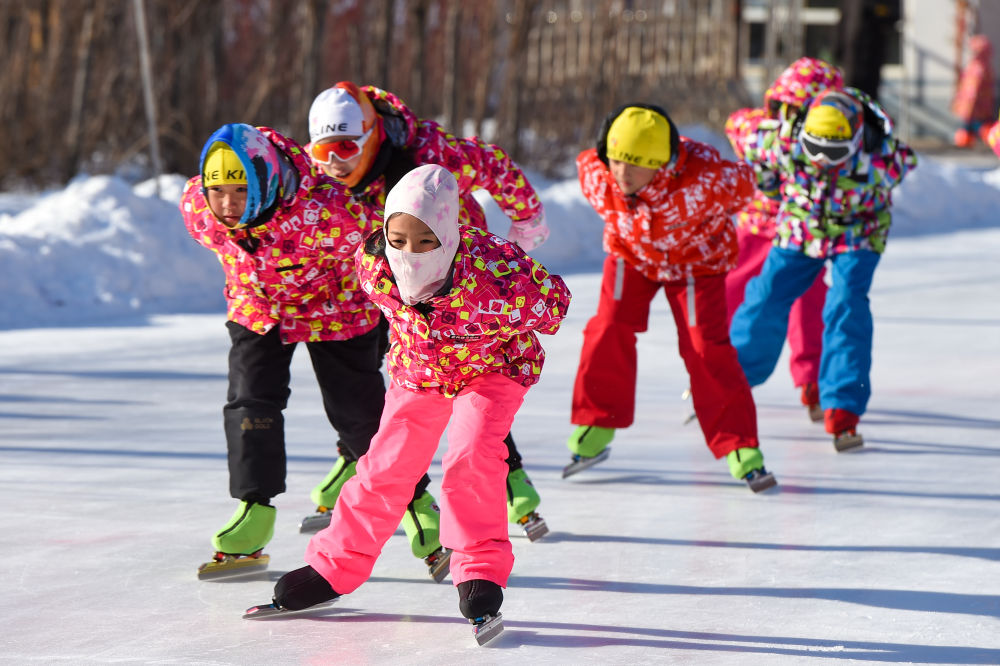 1月13日,在吉林省四平市六馬路小學(xué),學(xué)生們在冰場上滑行。新華社記者 張楠 攝