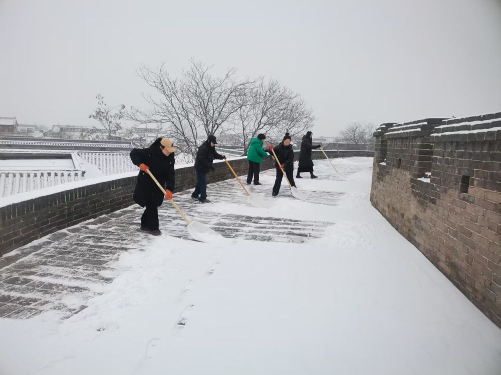 清晨6點(diǎn),平遙古城的城墻上已是一番忙碌景象。全程6公里多的環(huán)線上,工作人員手持掃帚、鏟子,正細(xì)心地清掃青磚上的積雪。