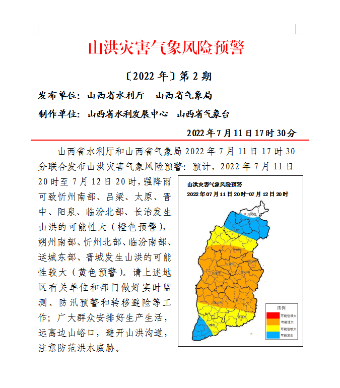 山西省水利廳和山西省氣象局2022年7月11日17時30分聯(lián)合發(fā)布山洪災(zāi)害氣象風(fēng)險預(yù)警:預(yù)計,2022年7月11日20時至7月12日20時,強降雨可致忻州南部、呂梁、太原、晉中、陽泉、臨汾北部、長治發(fā)生山洪的可能性大(橙色預(yù)警),朔州南部、忻州北部、臨汾南部、運城東部、晉城發(fā)生山洪的可能性較大(黃色預(yù)警)。