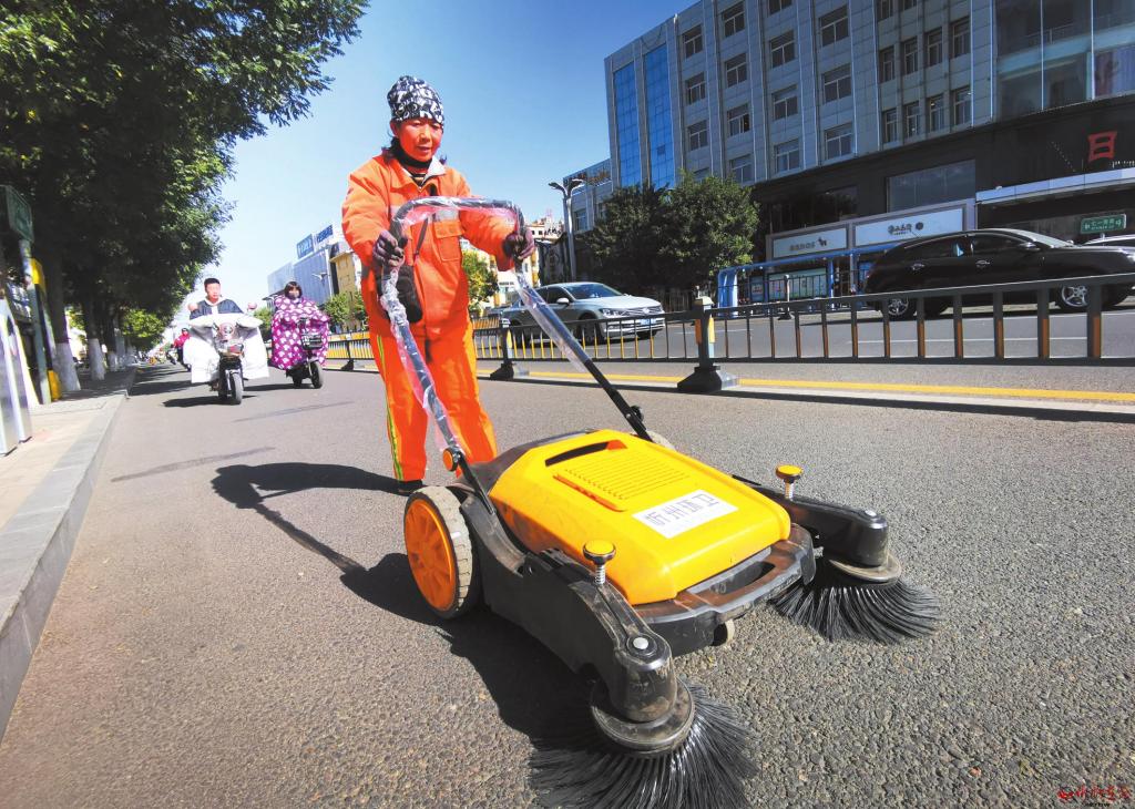 10月21日,環(huán)衛(wèi)工人在城區(qū)七一南路用新配置的無塵手推式掃地機進行清掃作業(yè)。為鞏固提升創(chuàng)文成果,市環(huán)衛(wèi)處狠抓清掃保潔、嚴控二次污染,多舉措提升衛(wèi)生質量,確保市民有良好的工作和生活環(huán)境。 (張存良 攝)