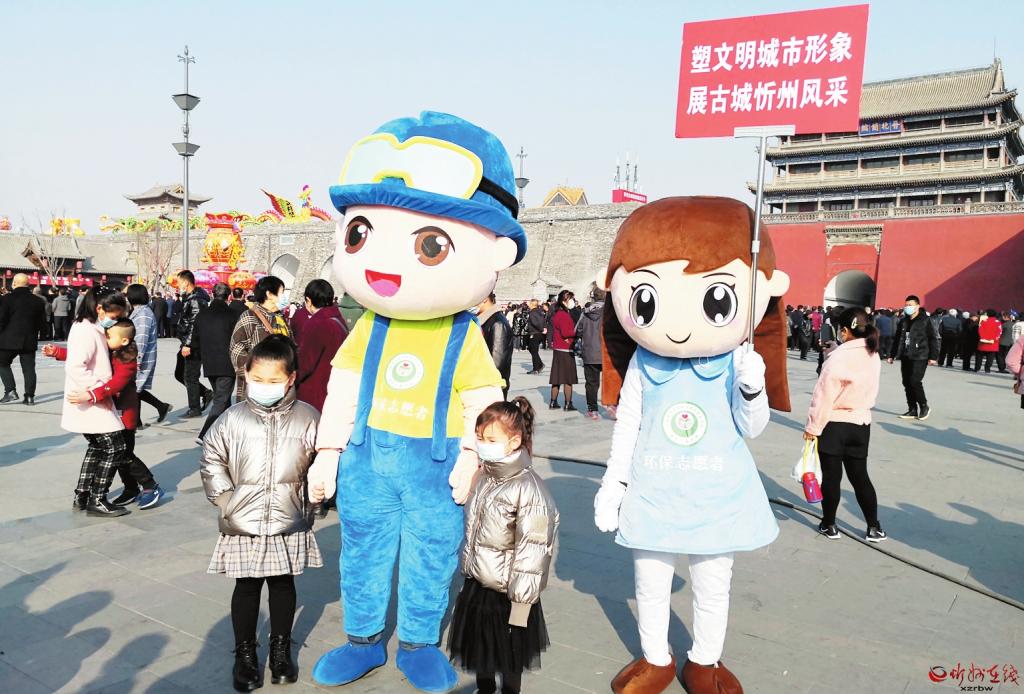 2月26日,農(nóng)歷辛丑年元宵節(jié),忻州古城北城門樓廣場上,兩名卡通形象裝扮的環(huán)保志愿者向群眾宣傳環(huán)保政策法規(guī),倡導(dǎo)環(huán)保過節(jié)、文明旅游。為豐富和活躍群眾文化生活,展現(xiàn)忻州古城保護活化新成就,元宵節(jié)期間,忻州古城舉行了社火游行,吸引了廣大市民。忻州市環(huán)保志愿者協(xié)會借機組織了環(huán)保宣傳活動。 (張劍雄 攝)