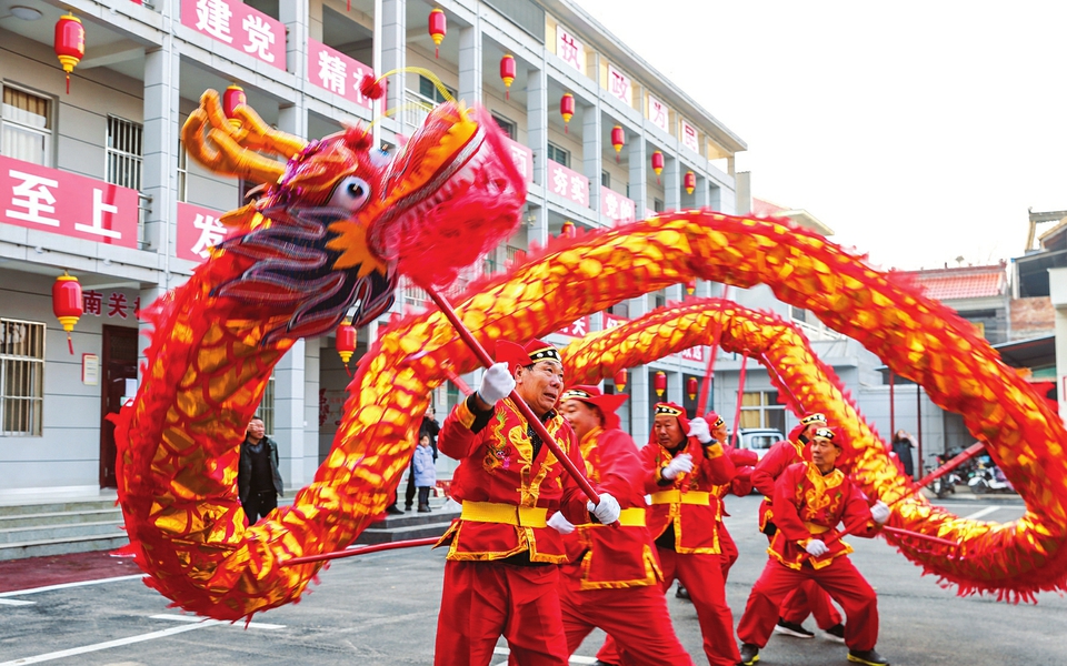 2月9日,在夏縣瑤峰鎮(zhèn)南關(guān)村黨群服務(wù)中心,村民在進(jìn)行《二龍戲珠》民間社火表演,喜迎新春佳節(jié)。張秀峰 裴國(guó)峰攝