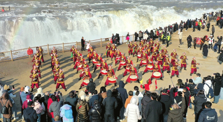 ①1月30日,吉縣壺口瀑布景區(qū)邀請鼓樂隊,為游客呈現(xiàn)了一場特色鮮明、氣勢恢宏的視覺盛宴。
