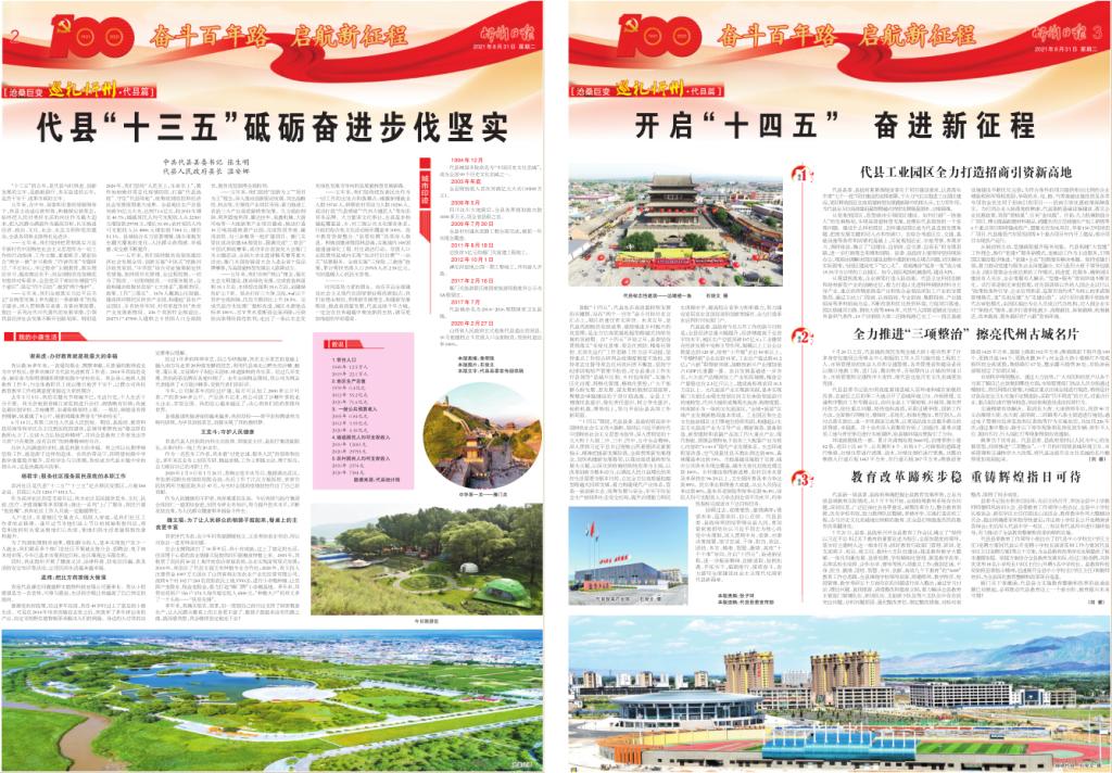 “十三五”的五年,是代縣與時俱進、創(chuàng)新發(fā)展的五年,是砥礪前行、務實奮進的五年,是苦干實干、成果豐碩的五年。