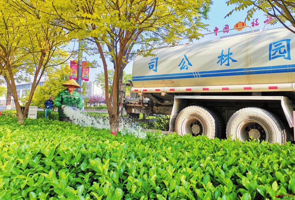 5月21日,園林工人在忻州城區(qū)長征西街澆灌綠化帶。近期氣溫上升,苗木需水量變大,園林工人每天三次為綠植補充水分,確保文明城市花園綠地郁郁蔥蔥。 (