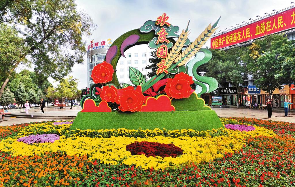 “十一”臨近,“歡度國慶”主題花壇亮相忻州城區(qū)日月廣場。(宮清華 攝)