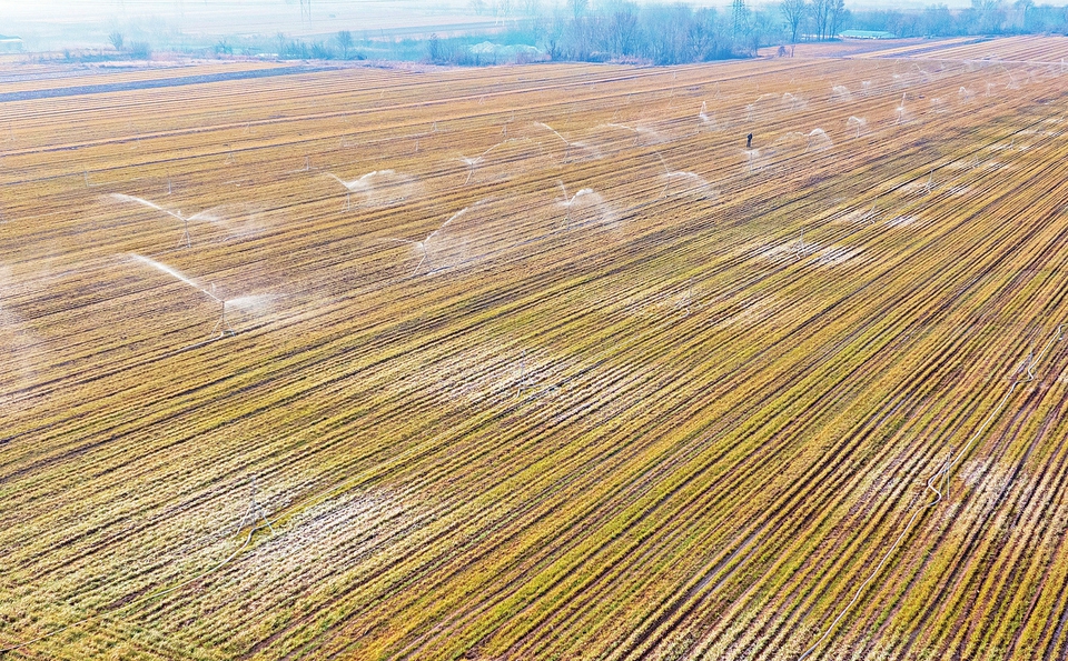 2月28日,臨汾市襄汾縣鄧莊鎮(zhèn)澗溝村,農(nóng)民采用智能水肥一體化技術(shù)對麥田進行噴灌作業(yè)。李現(xiàn)俊攝