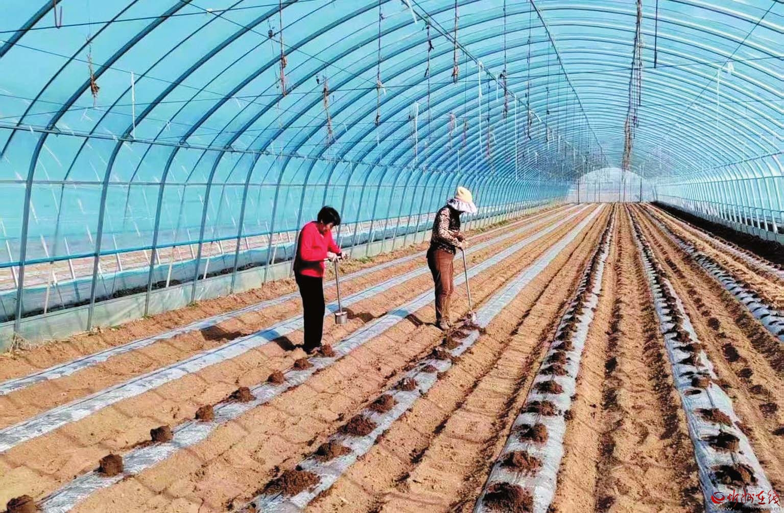 陽(yáng)春三月,春風(fēng)拂過(guò)雙乳山,西大王村的豆角產(chǎn)業(yè)園迎來(lái)豆角種植好時(shí)機(jī)。大棚里,六七個(gè)工人有序作業(yè),有的在點(diǎn)坑穴,有的在撒種、填土。一個(gè)大棚種好后,打開(kāi)閥門(mén),水流順著地上的滴管涌到坑穴,為剛?cè)鱿碌姆N子提供水分。據(jù)了解,西大王村采用“黨支部+集體經(jīng)濟(jì)合作社+農(nóng)戶”的發(fā)展模式,既為集體增收,又讓村民受益。今年,豆角種植園區(qū)一共有13個(gè)大棚,占地約40畝。為了搶抓農(nóng)時(shí),提前上市,賣(mài)個(gè)好價(jià)格,此次播種雇了許多村民幫忙,播種大約需要半個(gè)月時(shí)間才能完成。