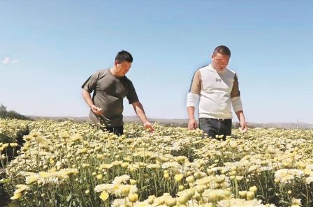 有了方向,行動是關(guān)鍵。黨員徐大衛(wèi)主動請纓,第一時間不遠(yuǎn)千里趕赴菊花主產(chǎn)區(qū)射陽考察菊花種植項目,經(jīng)過充分分析研判,篩選適宜五寨種植的品種,最終選定北京菊試種。同時,他帶著誠意誠心,從射陽請來3名技術(shù)專家。在晉西北中藥材產(chǎn)業(yè)孵化園附近,他與3位專家同吃同住,深入田間地頭,與群眾同勞作、共生活。依據(jù)菊花種植要求,手把手教會群眾平整土地、開挖溝槽、栽種澆水、鋤草施肥和采挖收儲等中藥材精耕細(xì)作技術(shù)。針對菊花農(nóng)殘、重金屬超標(biāo)的問題,在試種過程中,他精心研究、反復(fù)摸索,大膽探索出了一套適用于菊花的種植技術(shù),實現(xiàn)了菊花農(nóng)殘可控的突破,先試種的100畝菊花,獲得了成功。