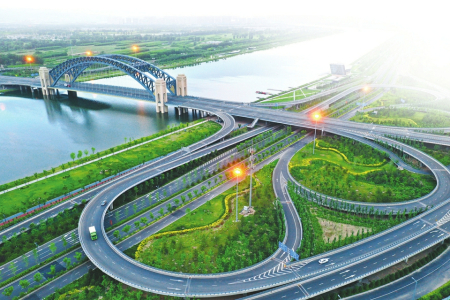晉陽橋,形如彩帶、態(tài)似彩虹,完美地詮釋了傳統(tǒng)與現(xiàn)代交融的設(shè)計理念,展現(xiàn)出莊重的對稱式美。夕陽西下,站在晉陽橋段東岸“汾河晚渡”觀景平臺遠眺西山,天際線、山脊線、水岸線層次分明,河面波光粼粼,畫舫古樸典雅,晉陽橋雄偉絢麗,呈現(xiàn)出一幅河、舫、橋、山渾然一體的秀美畫卷。