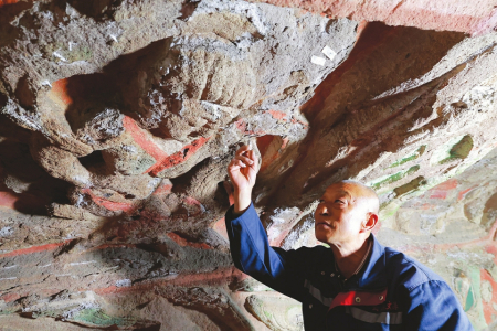 云岡研究院文保修復(fù)人員正在對受損文物進行修復(fù)。趙文貴攝
