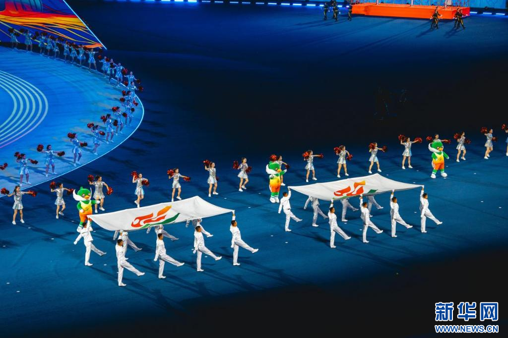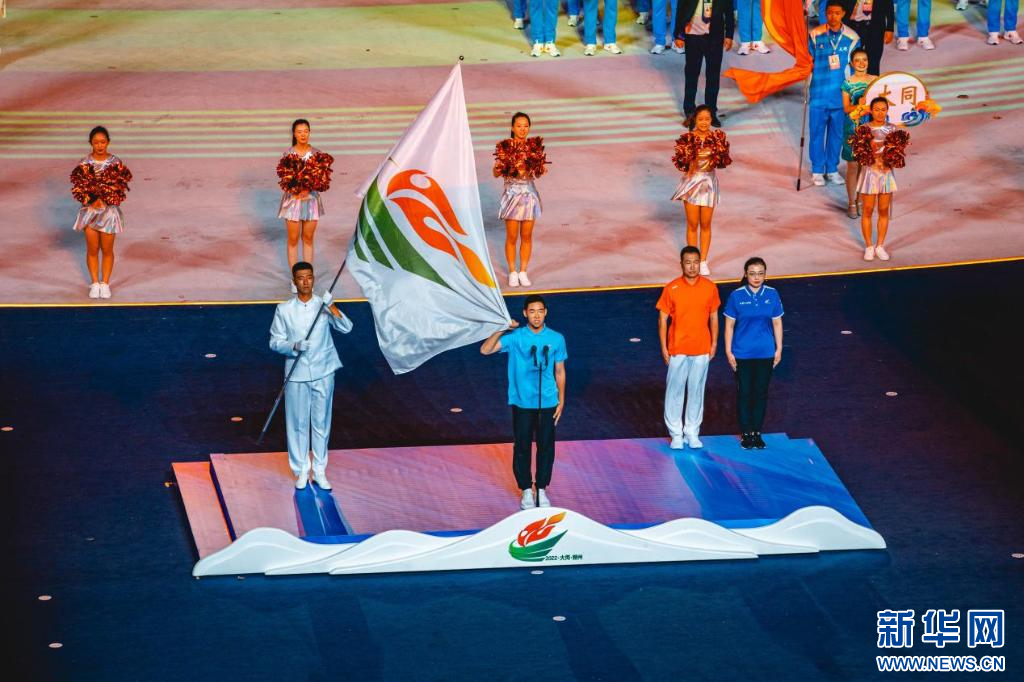 ??山西省運動會會旗、第十六屆省運會會旗入場。新華網(wǎng) 發(fā)(馬夢迪 攝)