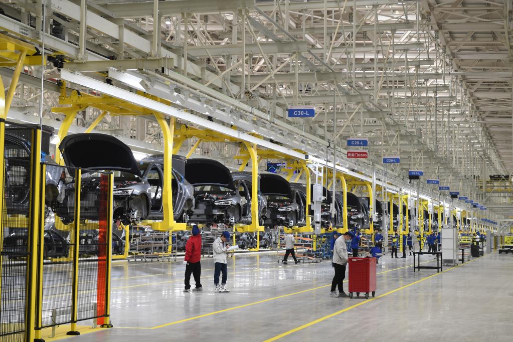 在合肥經(jīng)濟(jì)技術(shù)開(kāi)發(fā)區(qū)的一家新能源汽車生產(chǎn)企業(yè),工人在整車生產(chǎn)線上作業(yè)。新華社發(fā)(解琛攝)