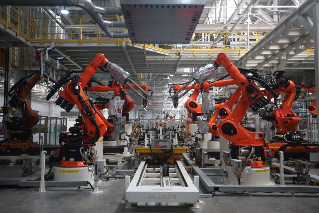 黃色的機(jī)械臂上下?lián)]舞,無(wú)人搬運(yùn)車穿梭不停,焊裝線火花四濺,配備了高精度傳感器和先進(jìn)機(jī)器視覺(jué)系統(tǒng)的焊接機(jī)器人正在精準(zhǔn)焊接車身部件……