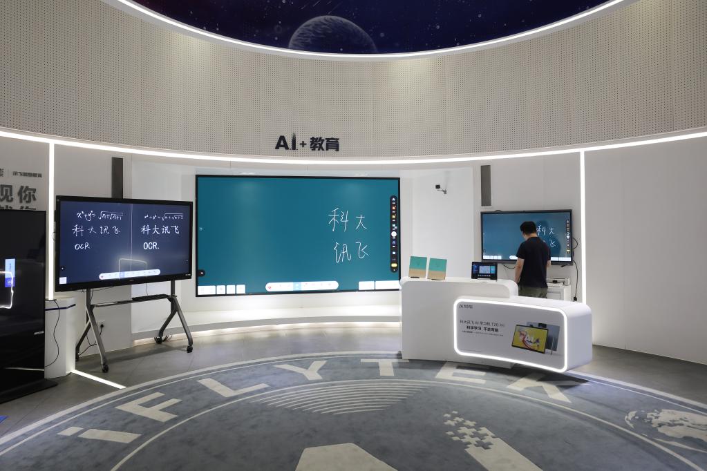 5月30日,在合肥科大訊飛人工智能體驗館,參觀者體驗應用于教育行業(yè)的人工智能產品。新華社記者杜瀟逸攝