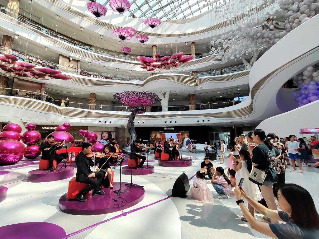 端午假期,海口國(guó)際免稅城內(nèi),伴隨著悠揚(yáng)的音樂(lè),陽(yáng)光傾瀉“天際秘林”夢(mèng)幻舞臺(tái),正在購(gòu)物的游客們紛紛駐足欣賞。“一場(chǎng)室內(nèi)音樂(lè)會(huì),給購(gòu)物消費(fèi)增添了新意和氛圍感?!焙?谑忻耜惱俪两陉?yáng)光和音樂(lè)中。