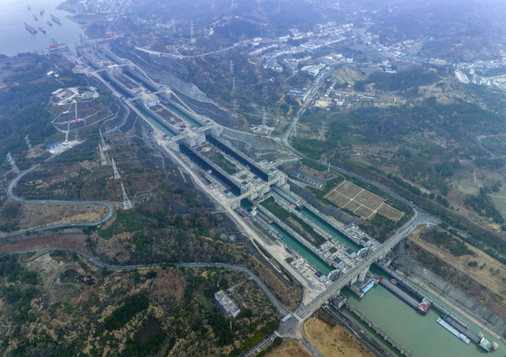 在湖北省宜昌市,船舶有序通過三峽樞紐五級(jí)船閘(2023年1月2日攝,無人機(jī)照片)。新華社發(fā)(王罡 攝)