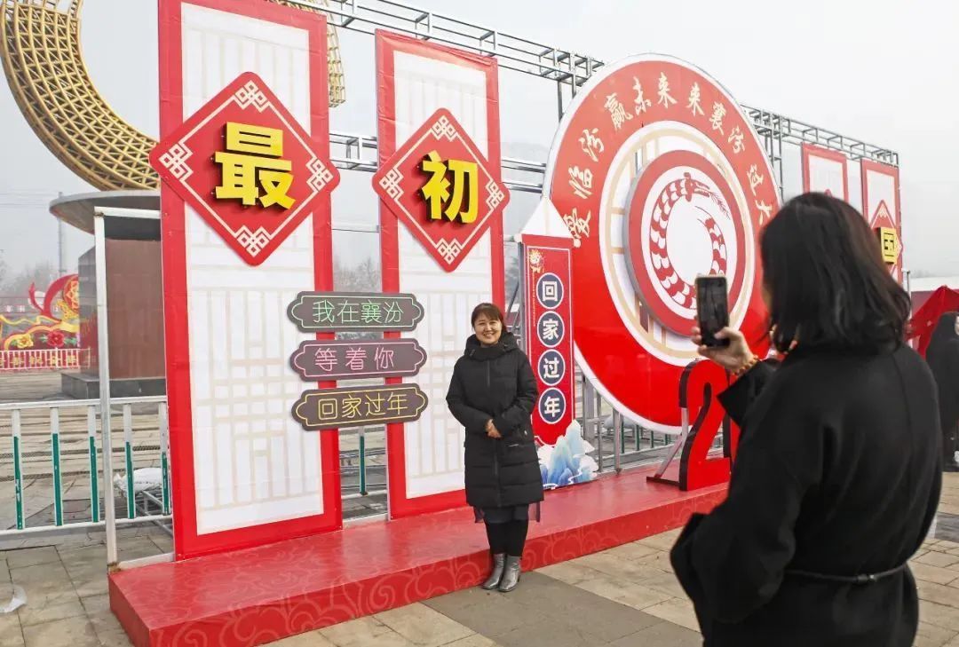 在臨汾,人們?cè)谙宸诙√瘴幕瘡V場(chǎng)內(nèi)陶寺龍盤展板前拍照,歡度新春佳節(jié);