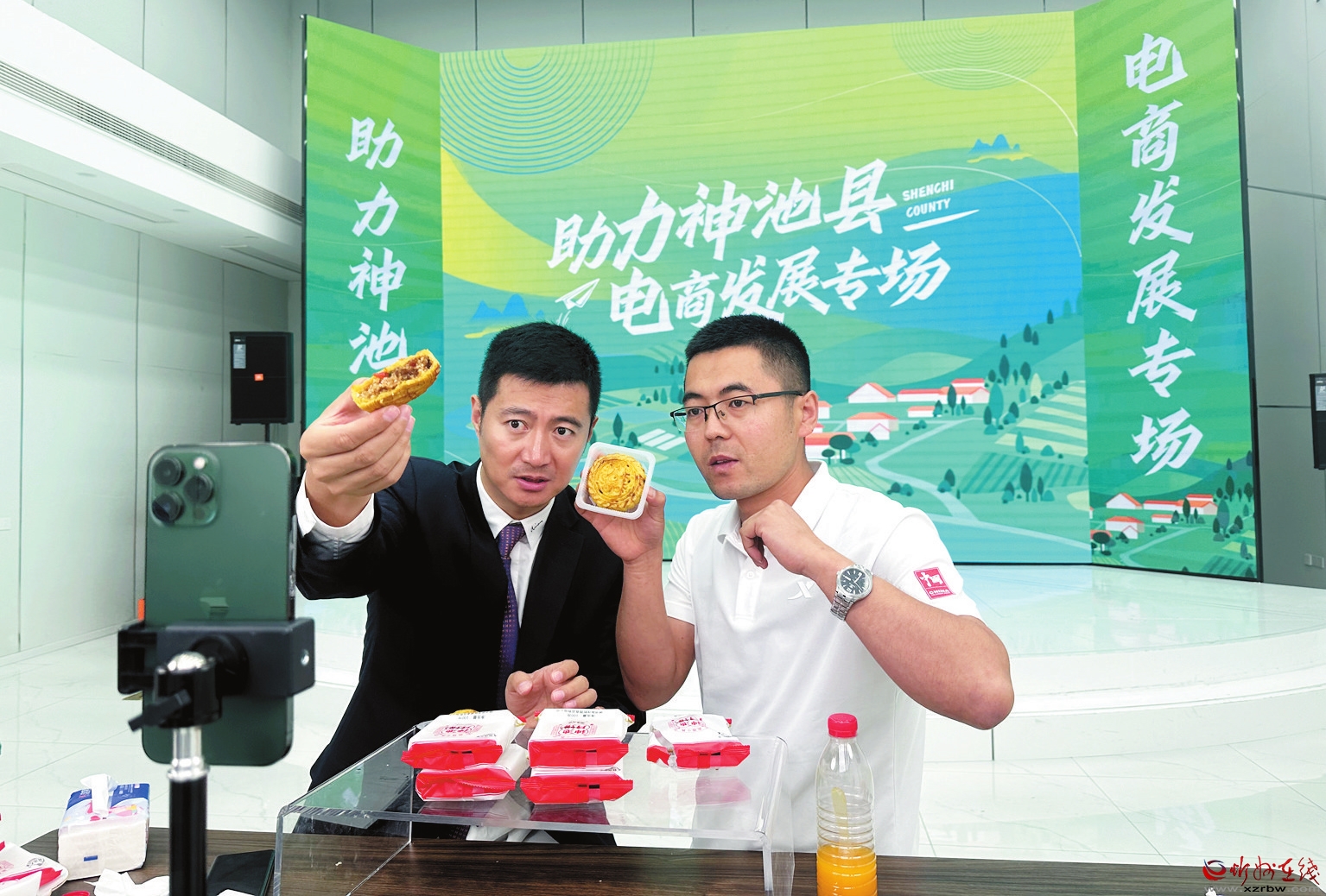 知名網(wǎng)紅王寶(左)與神池兄弟月餅青年主播高永勝(右)共同直播銷售神池餅。 鄭志東攝