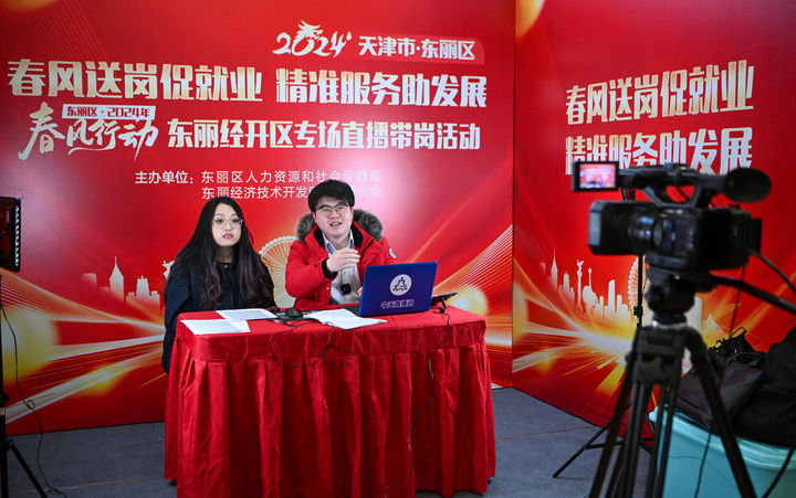 2024年2月29日,主播在天津市東麗區(qū)一場招聘會上進(jìn)行直播帶崗。新華社記者 孫凡越 攝