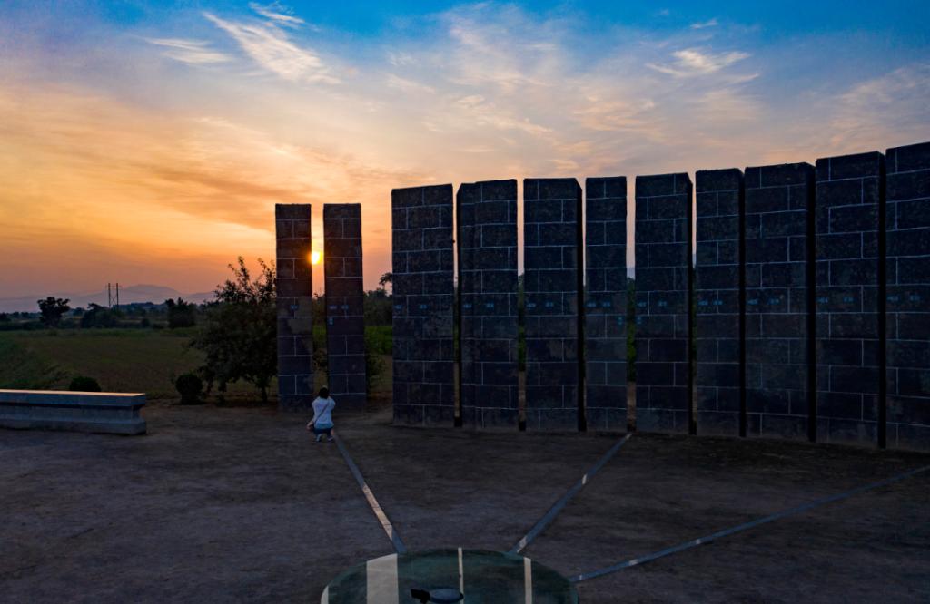 ▲2023年6月21日,人們在臨汾市襄汾縣陶寺遺址觀象臺觀看日出天文景象。當日是二十四節(jié)氣“夏至”,在山西省臨汾市襄汾縣陶寺遺址觀象臺,人們近距離體驗“太陽-觀測縫-觀測點”之間形成的三點一線天象奇觀,了解古代確定季節(jié)、節(jié)氣,安排農(nóng)耕的天文歷法。陶寺古觀象臺距今約4700年,是陶寺遺址考古中的重大發(fā)現(xiàn)。李現(xiàn)俊攝