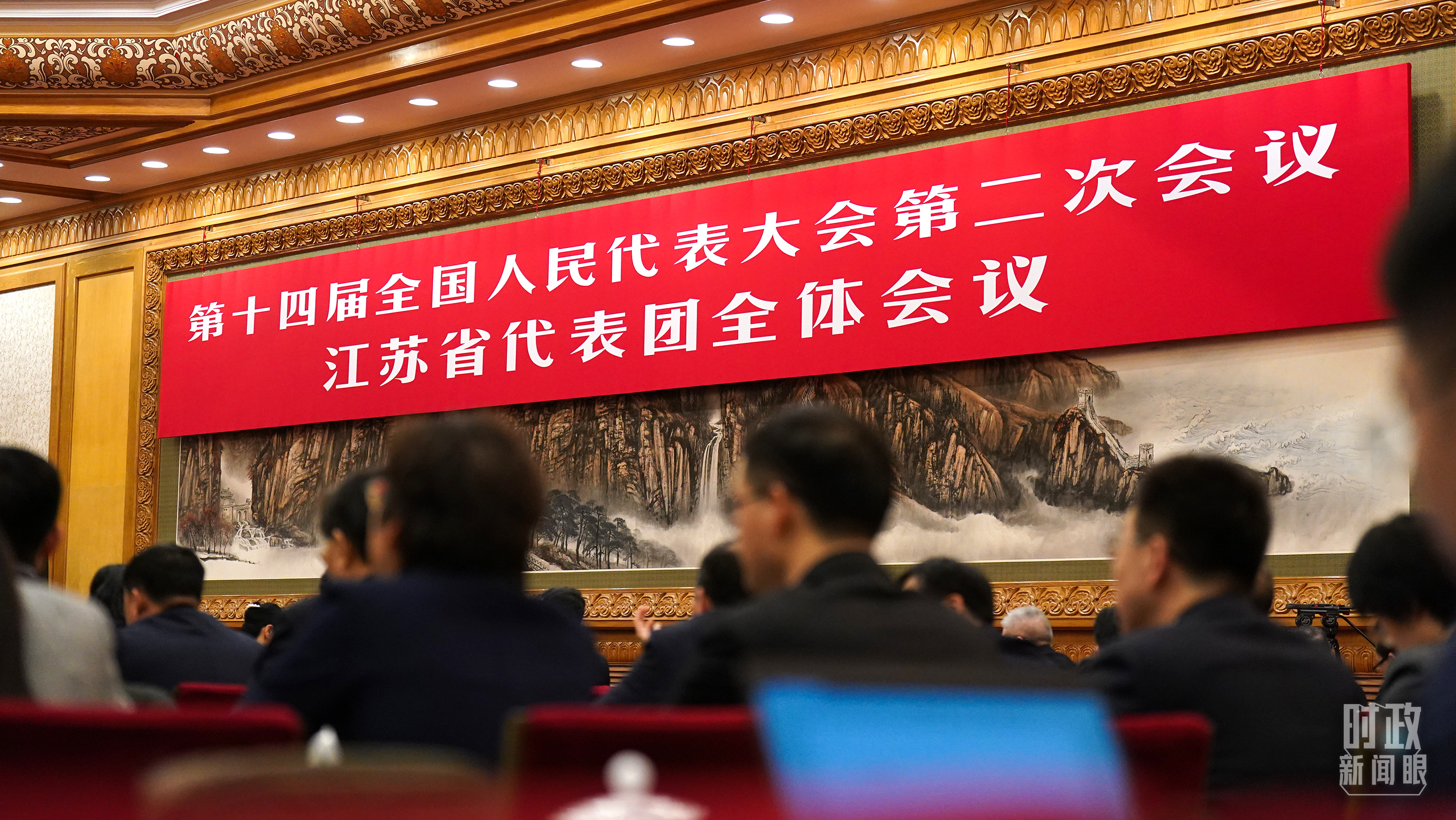 △江蘇代表團(tuán)全體會(huì)議,會(huì)標(biāo)醒目。(總臺(tái)國廣記者李晉拍攝)