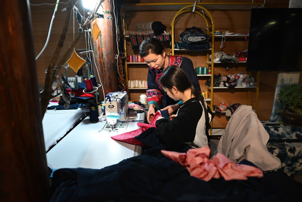 李利(后)在貴州省興義市萬峰林景區(qū)門店內(nèi)與員工一起制作民族服飾(2024年2月19日攝)。新華社記者 劉續(xù) 攝