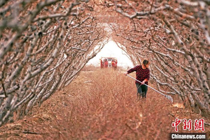 桃農(nóng)搶抓農(nóng)時,清除油桃樹間的雜草和落枝。高新生 攝