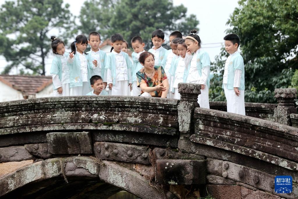 6月26日,在德清縣新安鎮(zhèn)舍北村,文化志愿者給孩子們講述萬善橋的歷史知識。(新華社發(fā) 謝尚國 攝)