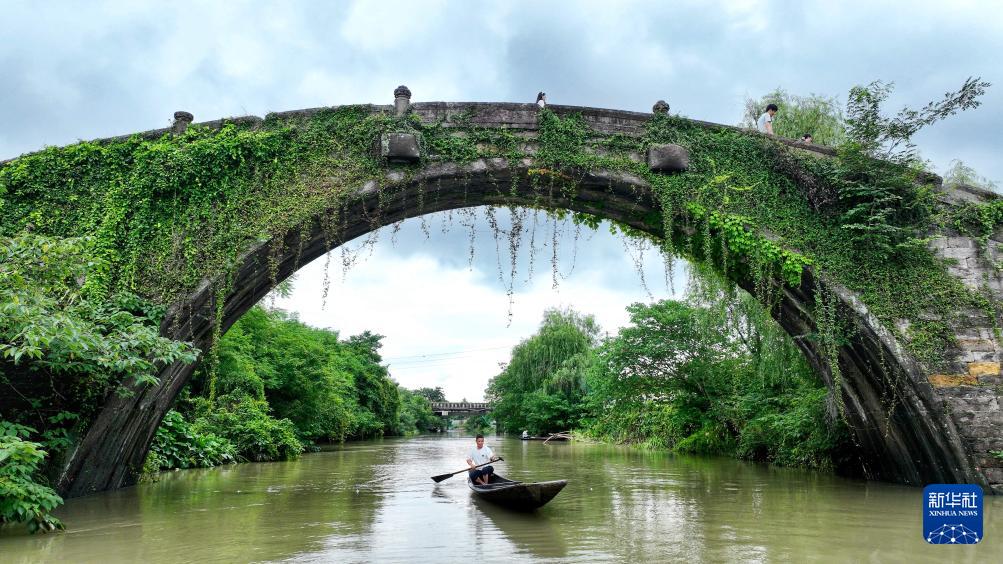 6月26日,在德清縣下渚湖街道二都村,漁民劃船從壽昌橋下經(jīng)過(無人機照片)。(新華社發(fā) 謝尚國 攝)