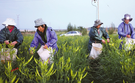 夜色如墨,黃花地里逐漸閃爍起點(diǎn)點(diǎn)星光,那是采摘工頭上佩戴的射燈亮了起來,他們?nèi)蔽溲b,長袖長褲、雨靴、雨衣、防蟲帽、頭燈一應(yīng)俱全。