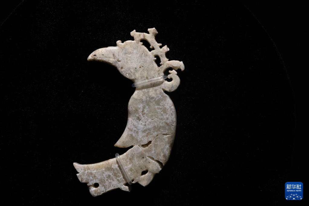 這是7月28日在重慶中國三峽博物館舉行的“玉出大江——長江流域史前玉器特展”上拍攝的肖家屋脊文化獠牙神面玉牌飾。(新華社記者 黃偉 攝)