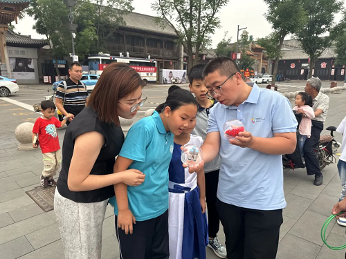 活動(dòng)現(xiàn)場(chǎng),在一個(gè)特殊的攤位上,由近到遠(yuǎn)分別擺放著“冰毒”“海洛因”“搖頭丸”等各種眼花繚亂的毒品仿真模型?!皝?lái)來(lái)來(lái),走過(guò)路過(guò)不要錯(cuò)過(guò)!”“瞧一瞧,看一看!”禁毒社工在“攤位”前賣力吆喝著,一陣陣吆喝聲引來(lái)了眾多游客,游戲通過(guò)套圈的方式,組織游客套中現(xiàn)場(chǎng)的毒品模型并準(zhǔn)確說(shuō)出毒品名稱即可獲得扇子、手機(jī)支架、帆布包等獎(jiǎng)勵(lì)。